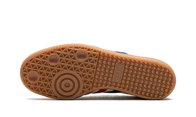 Its premium white leather upper keeps the look clean and minimalist, while the Three Stripes and navy blue heel add a striking and refined contrast. The golden detail with the name of the collaboration reinforces the exclusivity of the model. The soft gray suede toecap preserves the classic Samba texture, and the Gum natural rubber outsole completes the vintage design, offering durability, grip and exceptional comfort.