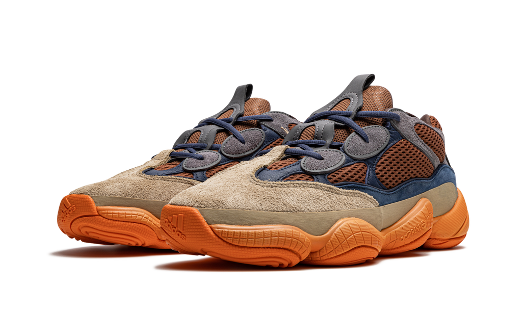 The Adidas Yeezy 500 Enflame is one of the most vibrant and daring editions of the Yeezy 500 line, created by Kanye West in partnership with Adidas. This model is known for its bold and dynamic color palette, bringing a combination of warm and intense tones, such as orange, red and yellow, with details in black and gray. The color Enflame, which refers to fire and intensity, is a highlight in the design, providing an energetic and modern aesthetic that stands out on any occasion.