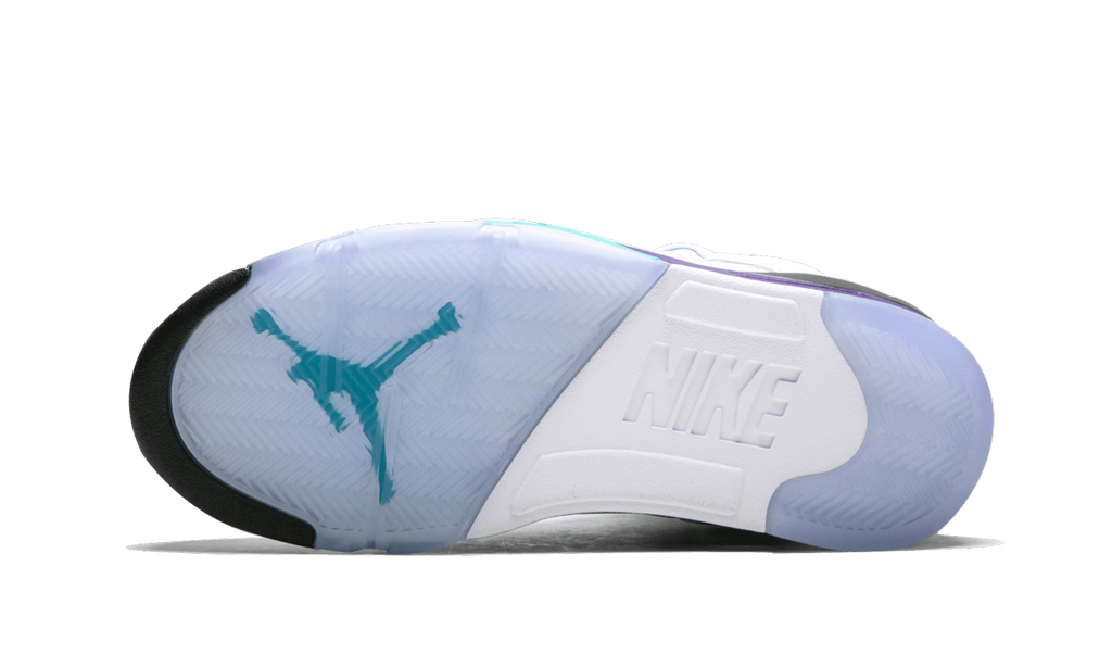 The upper part of the Jordan 5 Retro Grape is made of premium white leather, combined with details in purple and green, which are the predominant colors of the model and directly refer to the look of Will Smith's character. The tongue of the sneaker is also a highlight, with the iconic touch of silver, which blends perfectly with the rest of the design. The midsole features a mix of black, white and a tone of purple, which further reinforces the connection with the aesthetics of the series.