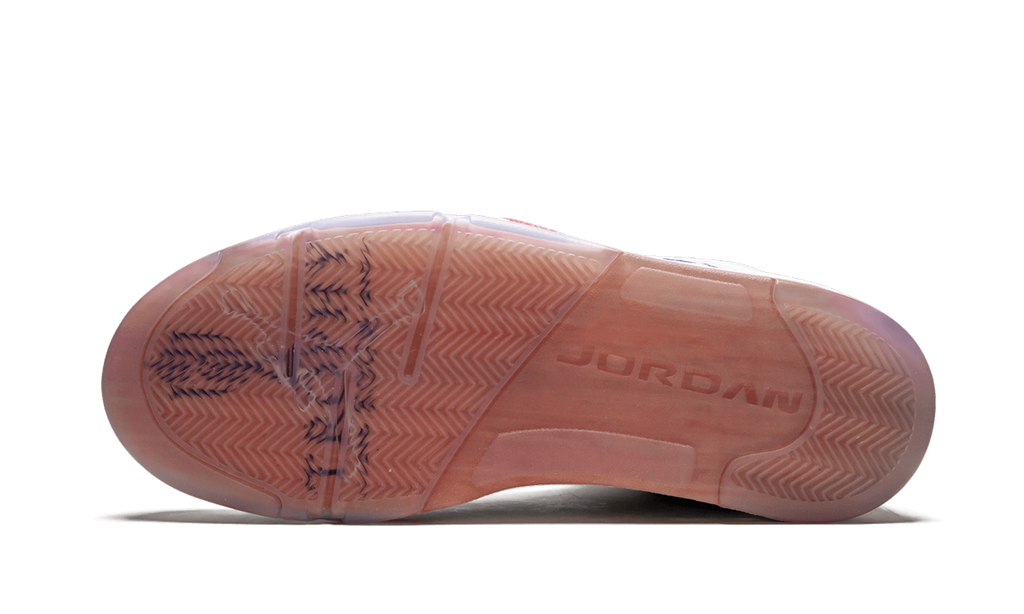 The upper of the Jordan 5 Retro "Trophy Room Ice Blue" features a mix of premium leather and synthetic material, with a tone of ice blue (Ice Blue) that brings a feeling of freshness and elegance. The Side Swoosh in silver reflection and white details add contrast, while the semi-translucent textile on the side panel and heel, which features the special Trophy Room logo, adds an exclusive and innovative touch. This elegant design is complemented by discreet gold details, such as the golden Jumpman on the tongue, which adds a touch of luxury to the model.
