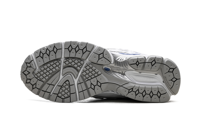 Its upper is made from breathable white mesh, ensuring lightness and ventilation, while the silver synthetic overlays add a sophisticated finish. The highlight is the details in Team Royal blue, present on the "N" side logo, on the collar and in parts of the sole, creating a vibrant and dynamic contrast.