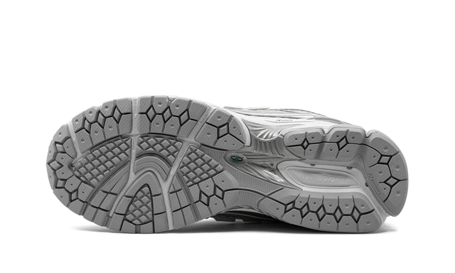 Its upper is made from silver breathable mesh, ensuring ventilation and comfort, while the synthetic and metallic TPU overlays add a premium and modern finish. The iconic lateral "N" logo appears with a discreet outline, maintaining the harmony of the design. Small details reflect the industrial and high-tech aesthetic, reinforcing its striking presence.